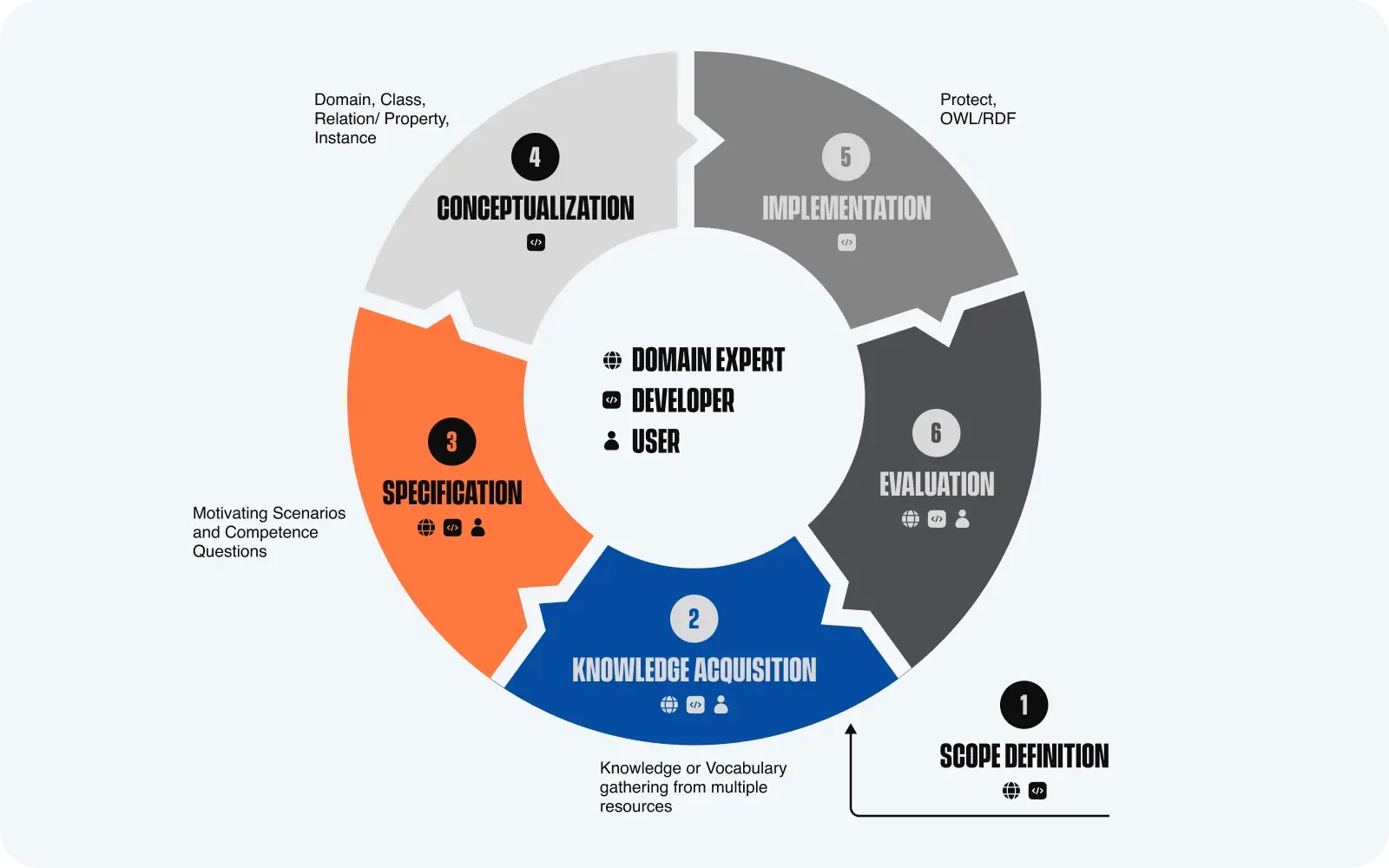 Ontology specification (3) & conceptualization (4): Formalizing of the elements identified in the previous step in the form of a knowledge representation, using the building blocks of ontologies: classes, attributes, relationships, subsumption.