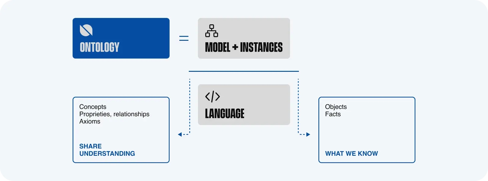 In computer science, ontology is a formal and structured representation of the concepts, relationships, and properties of a particular domain. An ontology generally comprises the following basic elements: concepts, relationships, properties, axioms, and instances. These can be graphically represented by the simplified equation shown below.