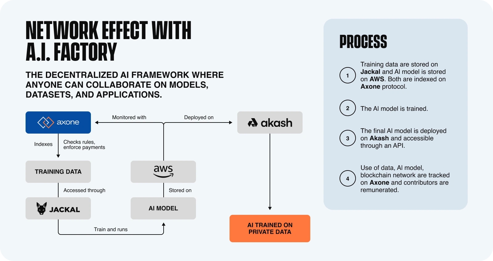 We believe that the AI Factory, by offering a highly customizable Training-as-a-Service, opens new perspectives in the field of AI development. This approach significantly expands the training capabilities of models while ensuring a diversity of applications to address. With its flexibility and advanced customization, the AI Factory becomes a powerful lever to meet specific and complex needs, providing an unprecedented common space for collaborative training and decentralized governance of AI models. This technological advancement represents a major step toward the creation of a dynamic and diversified AI training community, ready to tackle the most challenging issues in the field of AI.