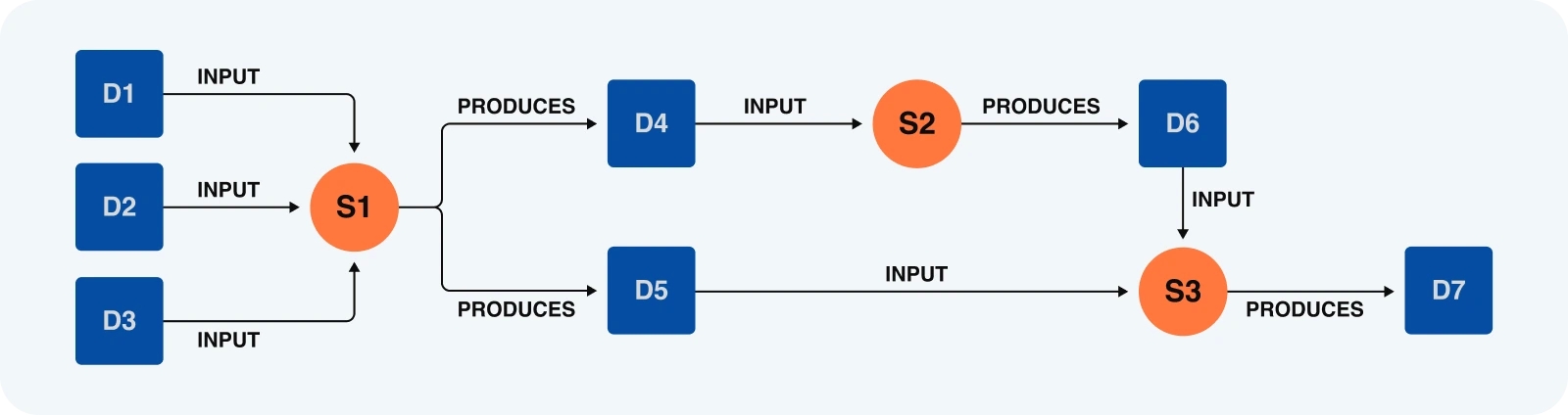 In the example above, we have a simple use case which involves three datasets (D1, D2, D3) that are used to produce the final knowledge (D7) after a series of transformations (S1, S2, S3).
