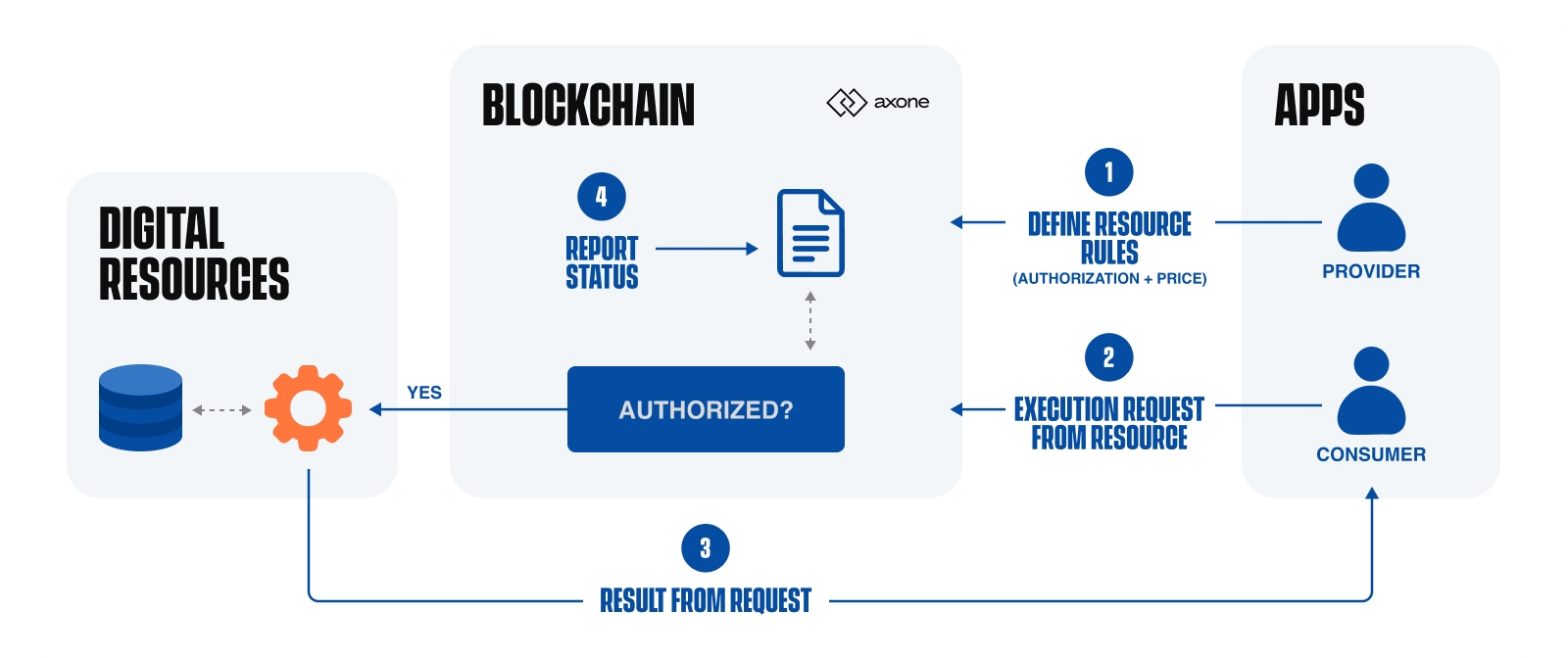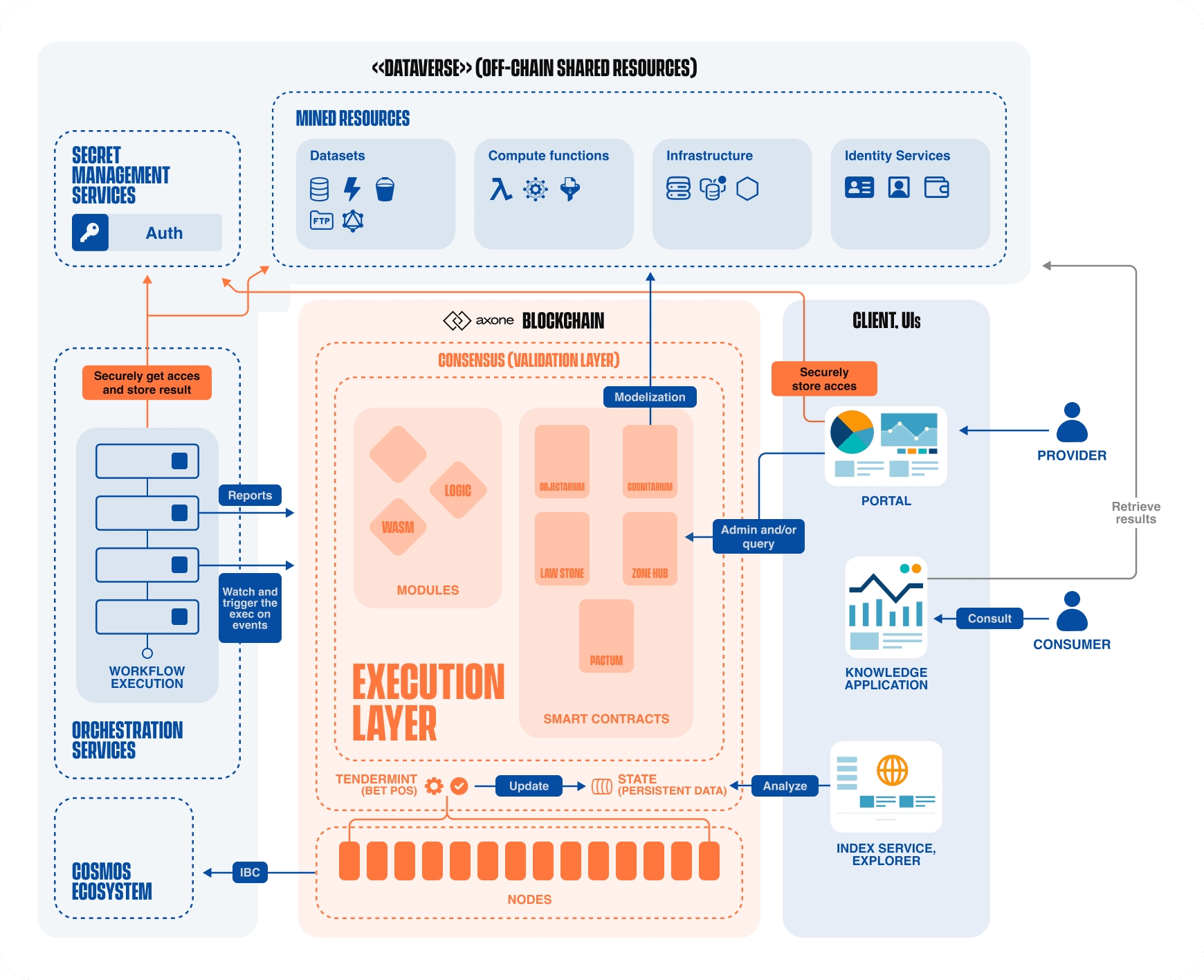 Smart contracts carry all these interactions with the blockchain. Nodes validate smart contracts execution and persistent storage through a consensus. A distributed database, the so-called blockchain, commits to every change. The Axone blockchain is built with custom modules enabling the protocol governance and validation rules capabilities, among other functionalities.